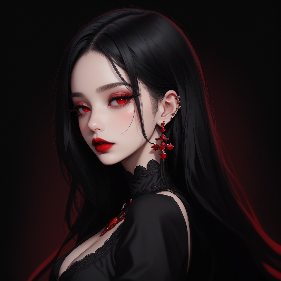 Goth girl, goth girl 1girl, 1girl,solo,long hair,breasts,looking at viewer,black hair,red eyes,dress,jewelry,upper body,earrings,parted lips,black dress,from side,lips,eyelashes,makeup,red lips, dark background, simple background, <lora:DetailedEyes_V3:0.8>, <lora:Goth_girl-v17-000001:0.8>