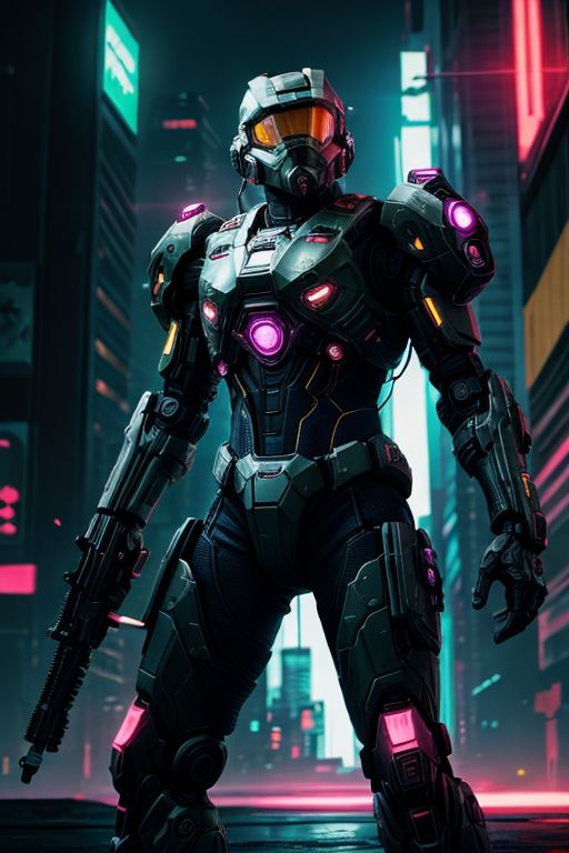 Master Chief, cyberpunk style, cyberpunk reimagined, neon lights, dystopian, vivid, glowing, hero view, action pose, cinematic scene, dramatic lighting, colorful, bright colors, science fiction, beautiful 8k, masterpiece, best quality, high quality, absurdres