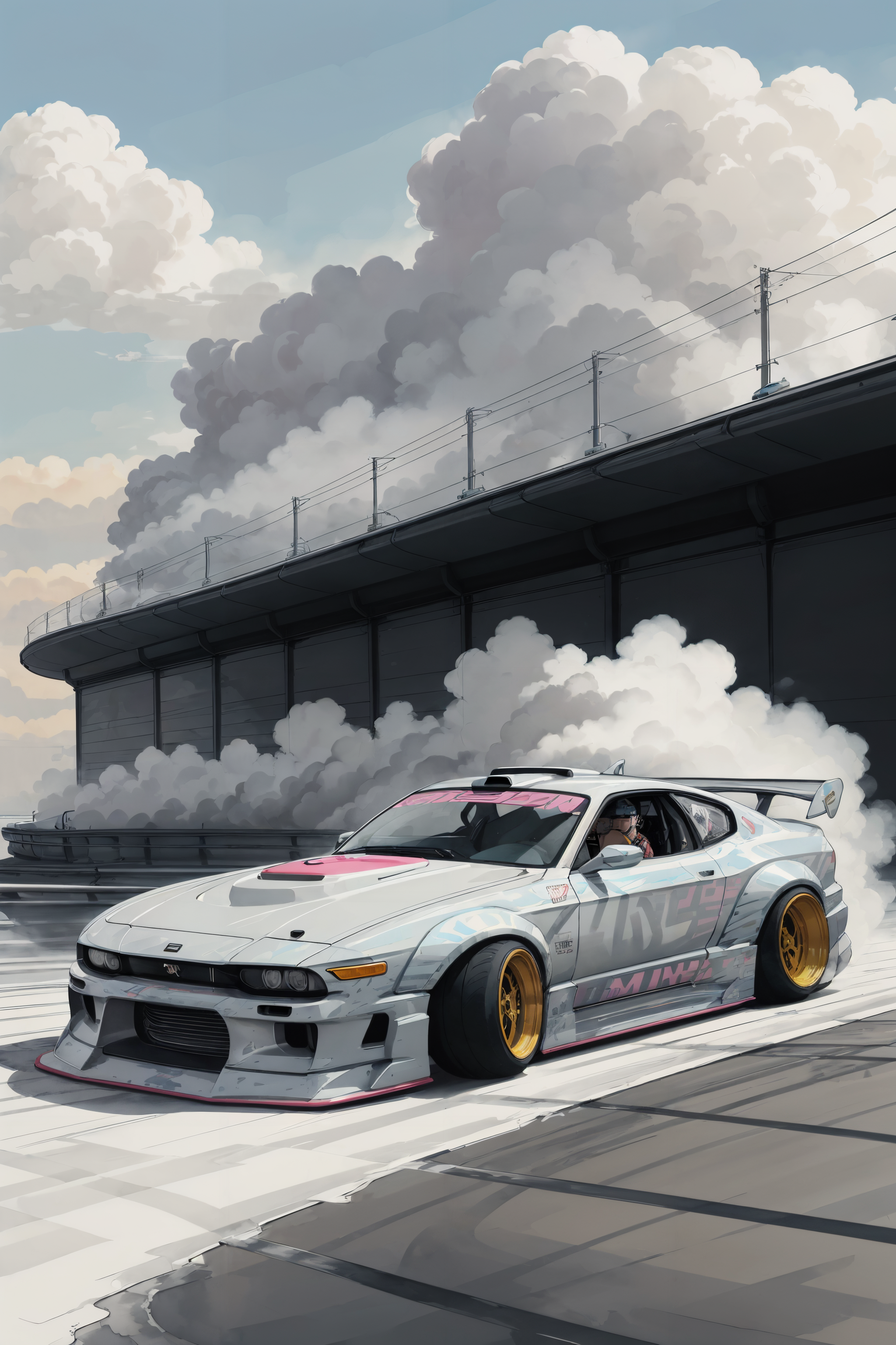 Vector illustration, pop art, very light pastel colored, watercolor, sketch, cardrifting, smoke, burn, 1 car, tuned JDM car, wide fenders, big rims, slammed, (drifting:1.2), on the road, tokyo city, parking lot, beautiful landscape, <lora:cardrifting:1.1>, <lora:zeekars:0.65>