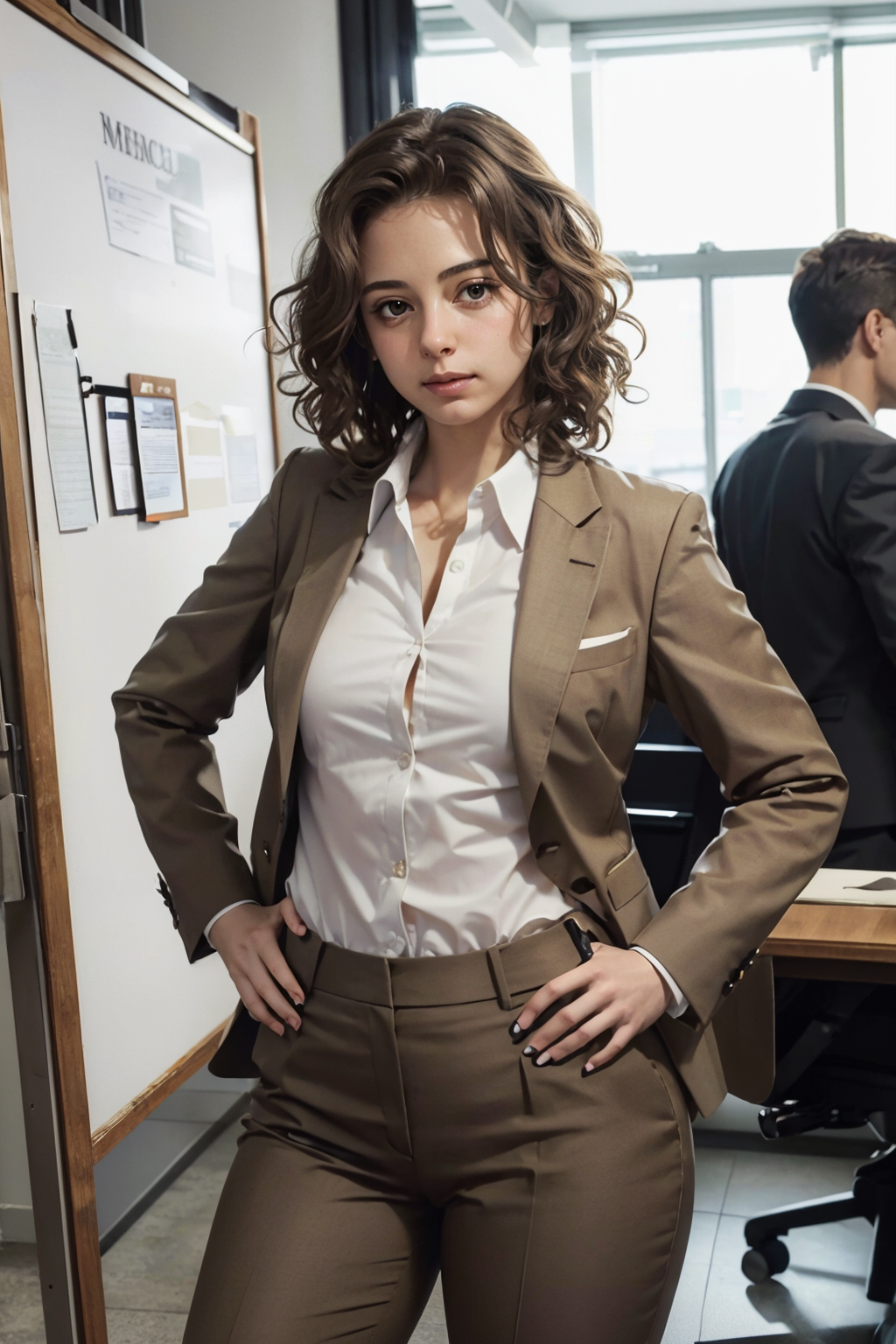 <lora:Erica:.8>, short brown hair, curly hair, make up, brown eyes, medium breasts, pear-shaped body,wearing a business suit, suit jacket, white collar shirt, slacks, looking at viewer, serious, medium shot, standing, hands on hips, inside a office, meeting room, long desk, whiteboard, bright lighting, extreme detail, masterpiece,