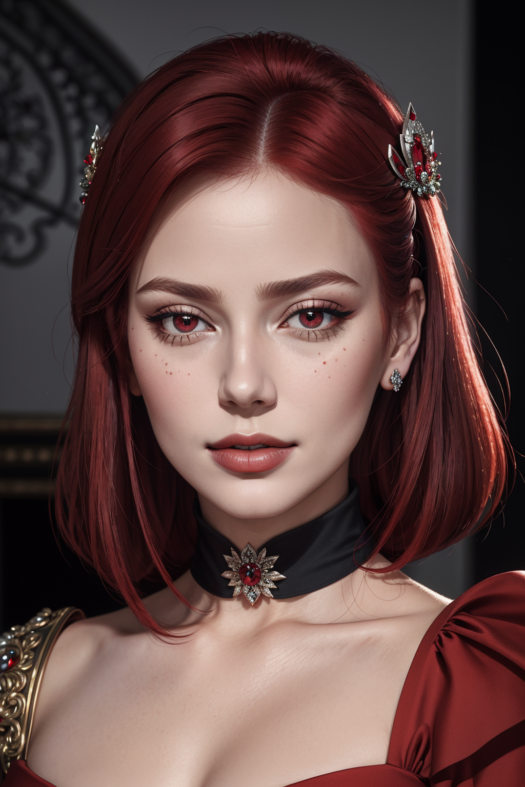 ((Masterpiece, best quality,edgQuality)),smirk,smug, edgAyre, red hair,red eyes,dress, <lora:edgAyre_AC6:1> edgParure_jewelery, a woman wearing a tiara and a sapphire sash , wearing edgParure_jewelery <lora:Parure_MINI:1>