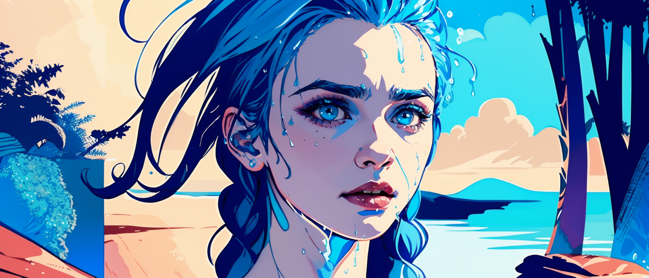 cinematic film still of wet haired girl, blue eyes, fear of the dark, realistic, <lora:jinxlol.z1tz:1>, jinx, league of legends, masterpiece, flat colors, <lora:lineart + flat colors v2:1.5>