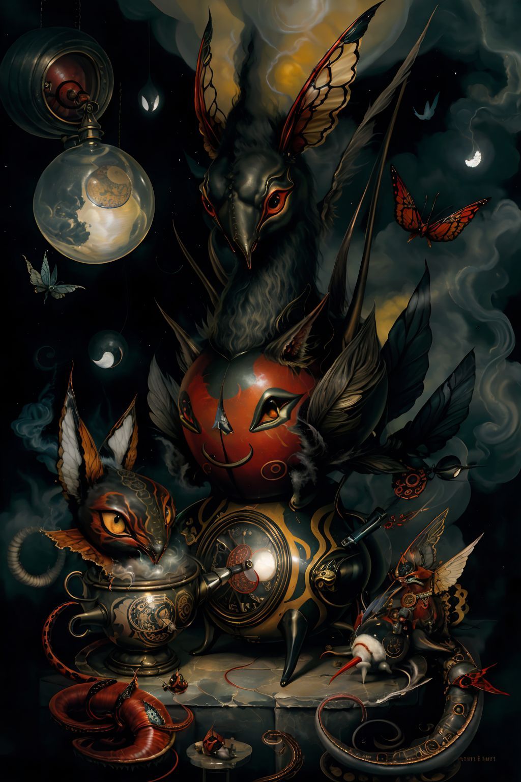 surreal00d, Kinabalu Giant Red Leech, Black Witch Moth, Elaborate, yellow smoke, butterfly, moon, mask, colored skin, kettle, Centaurs, tentacles, <lora:surreal00d-000010:1>