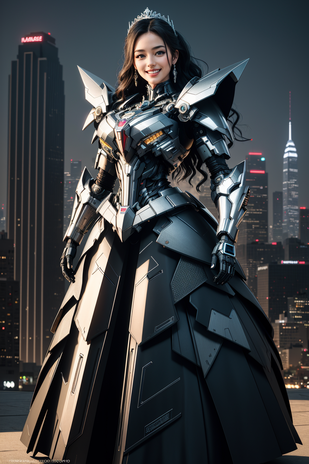 ((Masterpiece, best quality,edgQuality)), smiling,excited, edgMecha, a woman in a ballgown standing in front of a city at night ,woman wearing edgMecha_ballgown, mecha ballgown <lora:edgRoboGown:1>