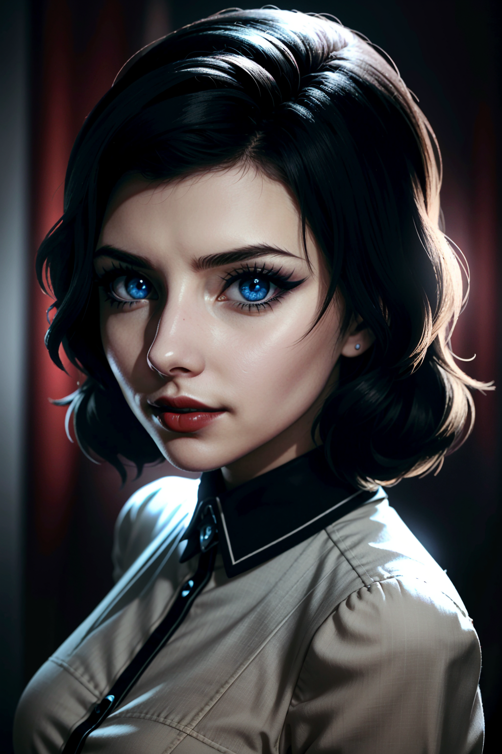 ((ultra detailed, masterpiece, best quality)) <lora:BioshockBurialElizabeth:0.9> BioshockBurialElizabeth, 1girl, solo, black hair, blue eyes, red lipstick, portrait