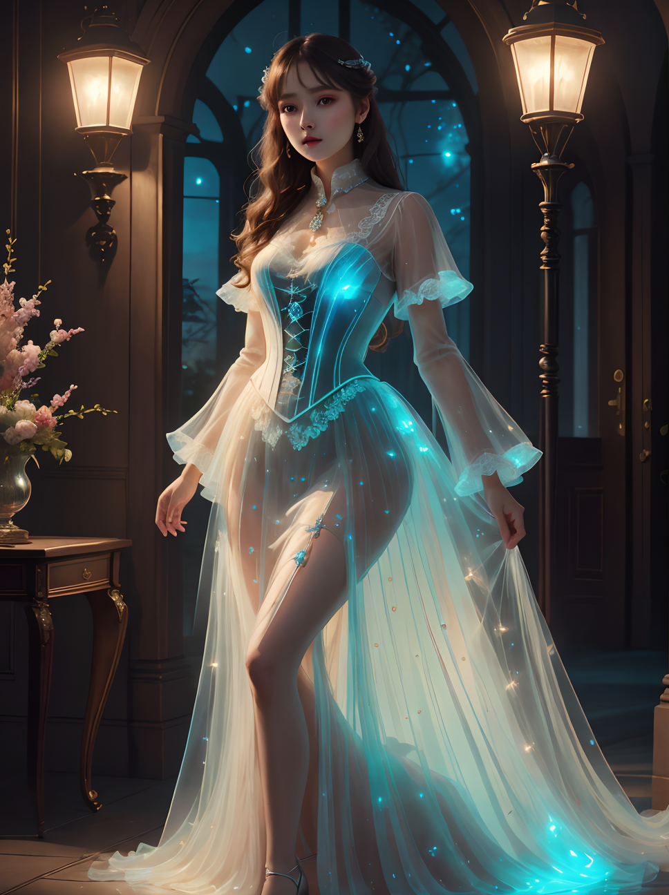 8k, masterpiece, highly detailed, beautiful woman, <lora:n15g_aio_clothing-1.0:0.8>, blue bioluminescent victorian dress