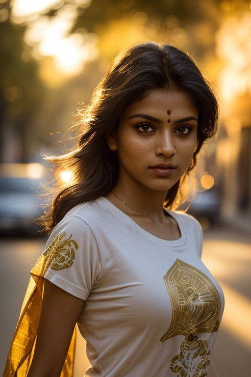 Dollie Nobody SD15 beautiful Indian woman Head shot of a woman running in a city road, wearing a (tshirt with short :1.3) Lighting-Gold foreground objects background details (masterpiece:1.2) (photorealistic:1.2) (bokeh:1.2) (best quality) (color grading) (detailed skin:1.3) (intricate) (8k) (HDR) (cinematic lighting:1.3) (sharp focus) (Clutter-Home:1.2) <lora:epiNoiseoffset_v2:1> Gold foreground objects background details: This refers to a lighting setup where the foreground objects and background details are bathed in a warm golden light. This creates a visually appealing contrast and adds a touch of enchantment to the scene.