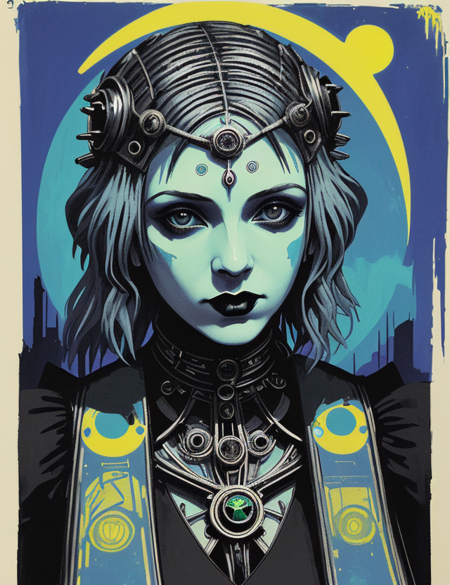 woman, Gothic, Solarpunk, Poignant, Metropolis Light Transport, RE Engine, Fauvist, Printmaking, Pop Art