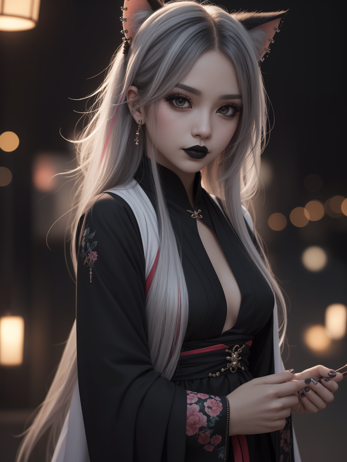 (masterpiece:1.2),best quality, extremely detailed, catgirl, goth girl (goth makeup:1.2), random hair, random haircolor, random multicolored hair, streaked hair, detailed hair, (random eye color), blurred background, lantern festival , visually stunning, bokeh, ,piercings, hanfu,