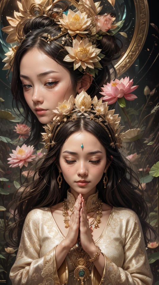 (abstract art:1.2), (fractal art:1.1), masterpiece, highest quality, absurdres, incredible details, ultra detailed, 8k, cinematic, extremely intricate, professional painting, beautiful, visually stunning, gorgeous, myths, (1girl, cute), cleavage, sexy, prayer beads, bow your head, close your eyes, meditation, meditate, lotus, pulsating energy, beautiful hands,close eyes,perfect hands,Hands on both sides,beautiful face, magic charm, lotus_Portraits light color theme, (satisfy:1.3), (happy:1.2), messy hair, happy atmosphere, (emotional:1.2), warmth, full-frame portrait composition, Animation, (random view, random shot, running:1.2), <lora:add_detail:0.45>, <lora:Gardenia_Portraits:0.5><lora:GoodHands-vanilla:1>