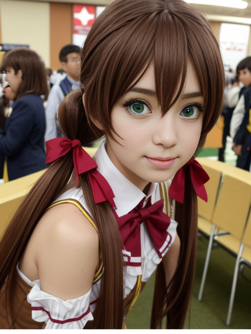 best quality, masterpiece, highres, detailed, perfect anatomy, <lora:Detail - add_detail:0.2>, brown hair, green eyes, RoroaAmi, indoors, cosplay convention, happy, <lora:Character - RoroaAmi:0.6>, 1girl, cosplay, realistic, low twintail, ribbons, realistic eyes, .35mm camera,