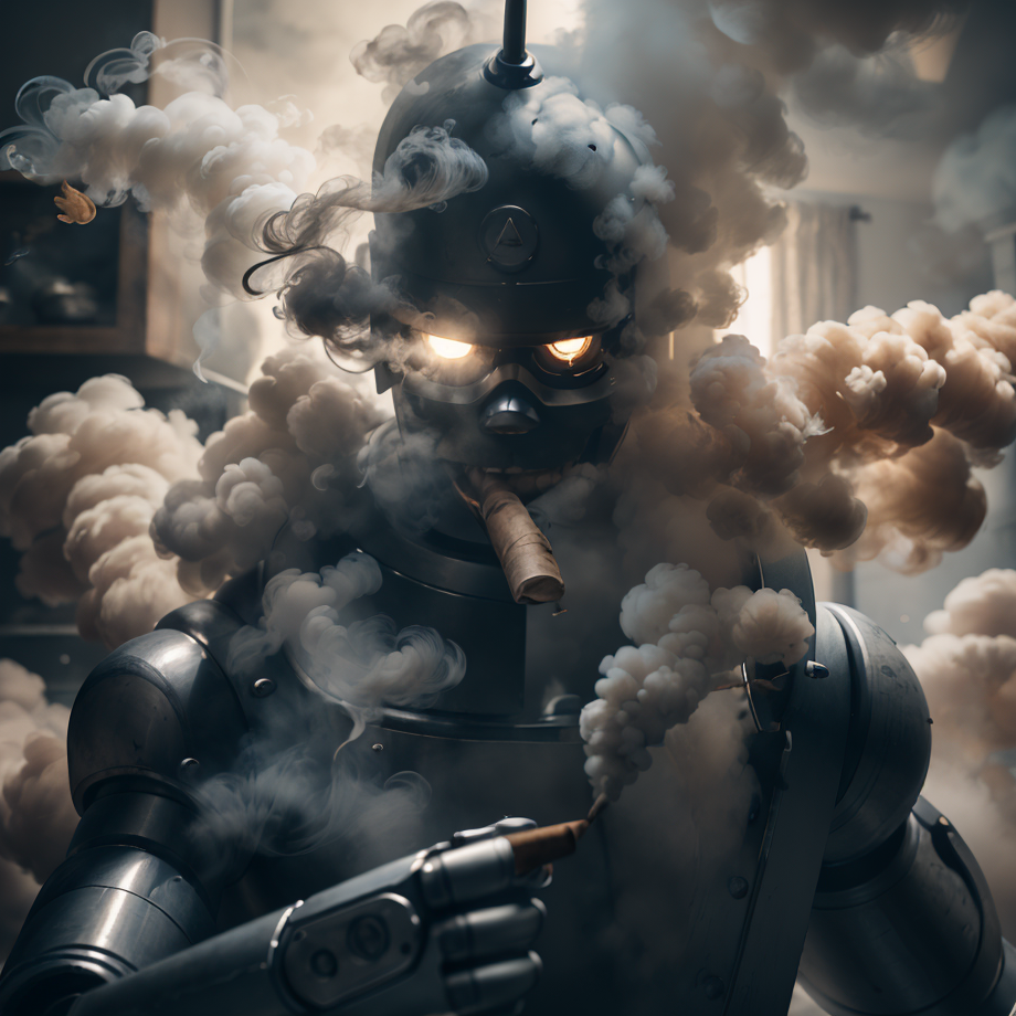 bender, robot, titanium body, glowing eyes, smiling, smoking a huge cigar, indoors, living room, blowing smoke through mouth, smokey ambiance, close up, <lora:sd15-bender-lora:.9> ,<lora:Concept - Smokemancer:.8> extremely detailed, hdr, reflective lighting,