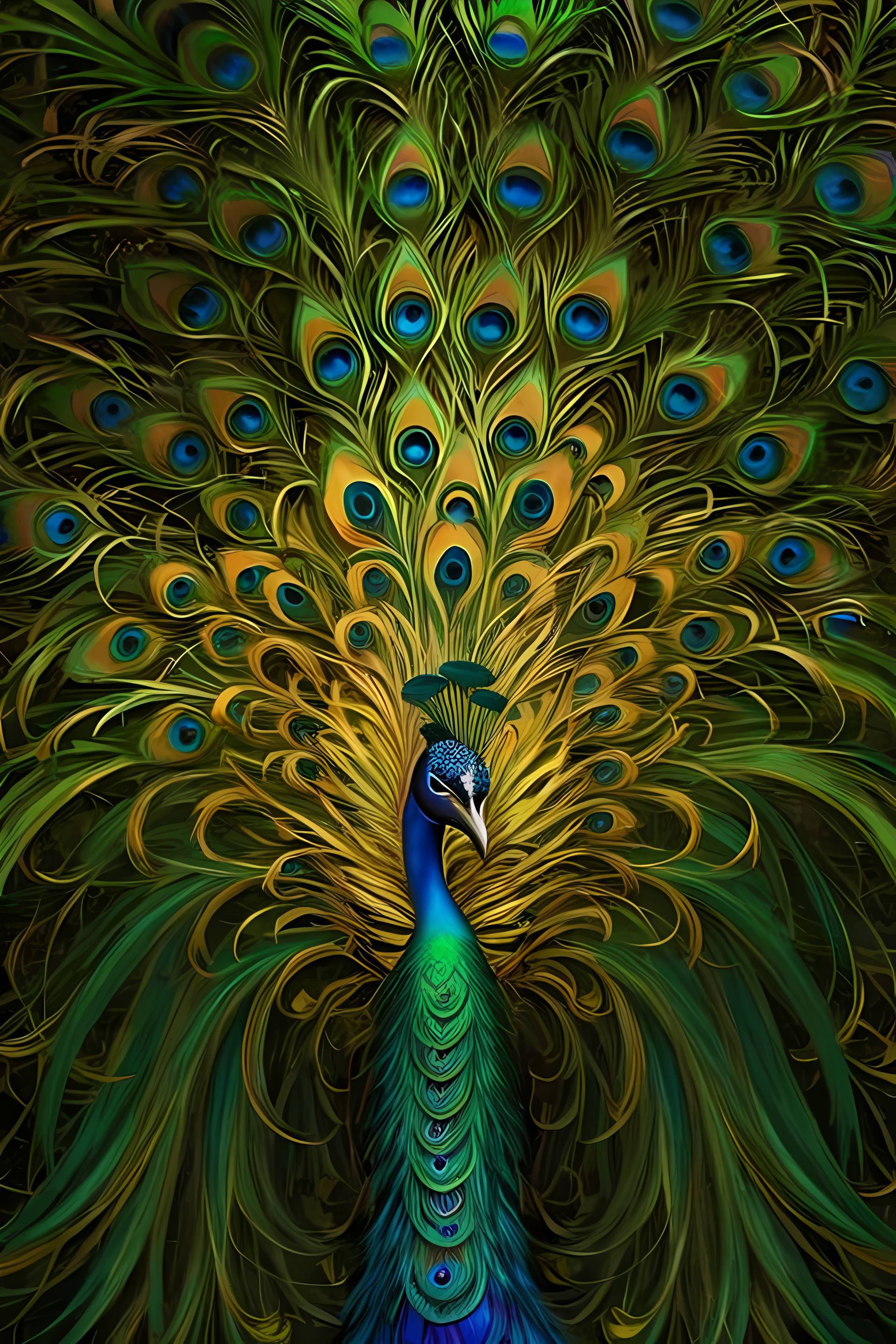 peacock iridescent tails, (a lot of peacock tails), dense big peacock pattern, gold and blue peacock tail, brighter