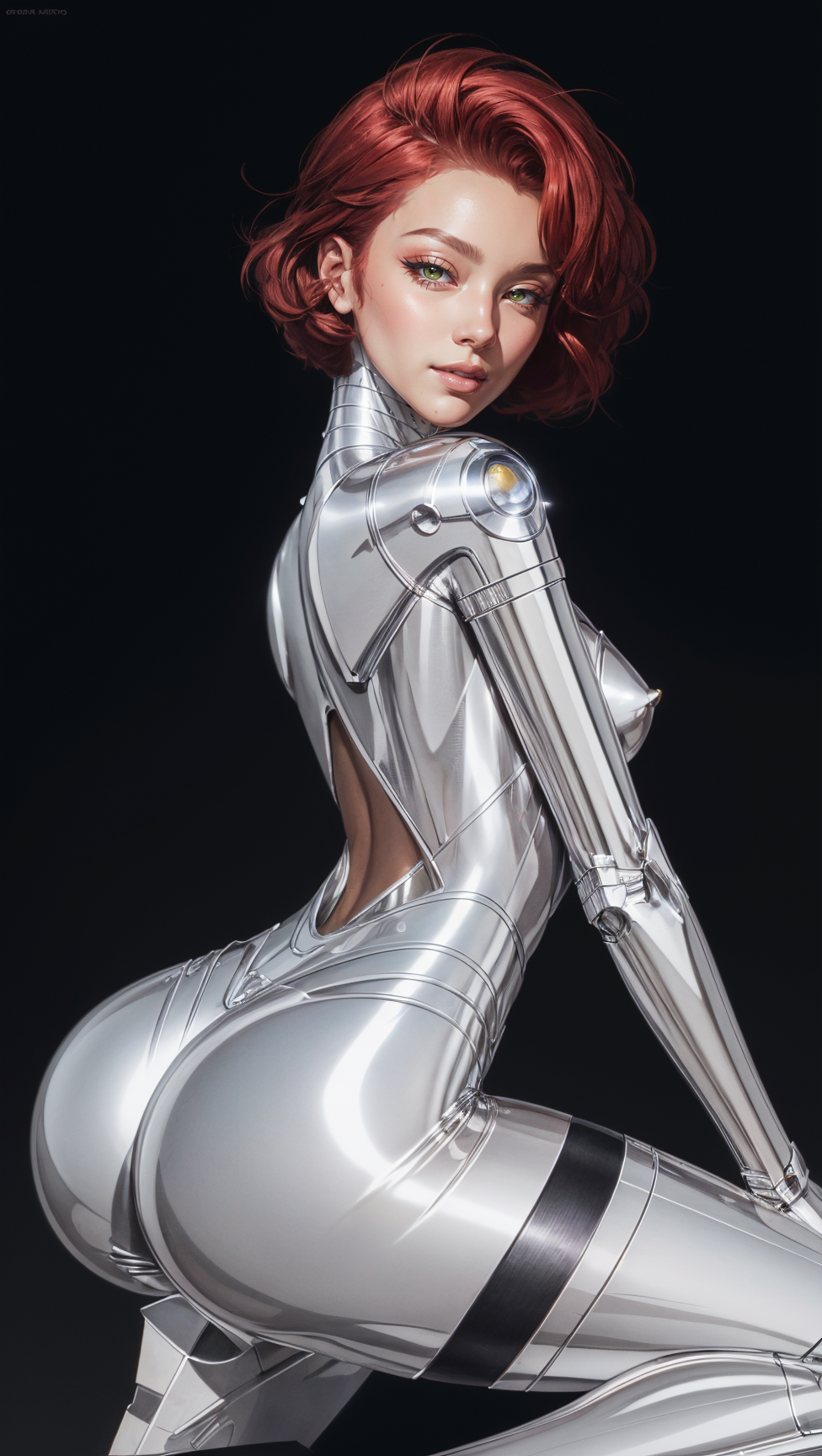 Sorayama Style, silveroid metallic skin, highly detailed face and body portrait by wlop. fantasy art from dnd extremely beautiful style of ilya kuvshinov on greg rutkowski in the shell, red hair, dat ass (meme), (bare_legs:1.1), black background, <lora:hajime_sorayama_finetuned:0.7>,