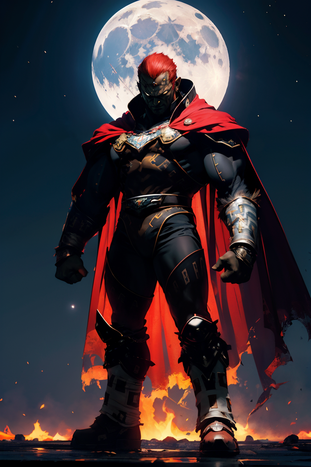 OoT_Ganondorf_Zelda,tall, muscular, red cape, wearing brown armor, serious, angry, intimidating ambiance, outside, roof, hyrule, night, moon lighting, fire, simple background, extreme detail, hdr, <lora:OoT_Ganondorf_Zelda:.7>,