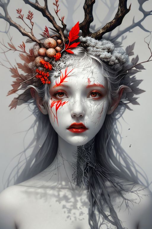pale skinny girl sitting on huge branchfull body,grey background,(broken face:1.2),((white and red)),growth, ,white and red,blood and snow,grey background,,growth,red leaf,tree branch on head,branch, fractal,branch arm,branch legs,girl made of branch.aestheticism ,(masterpiece), best quality,1girl,solo, looking_at_viewer,vivid//((fantasy style),