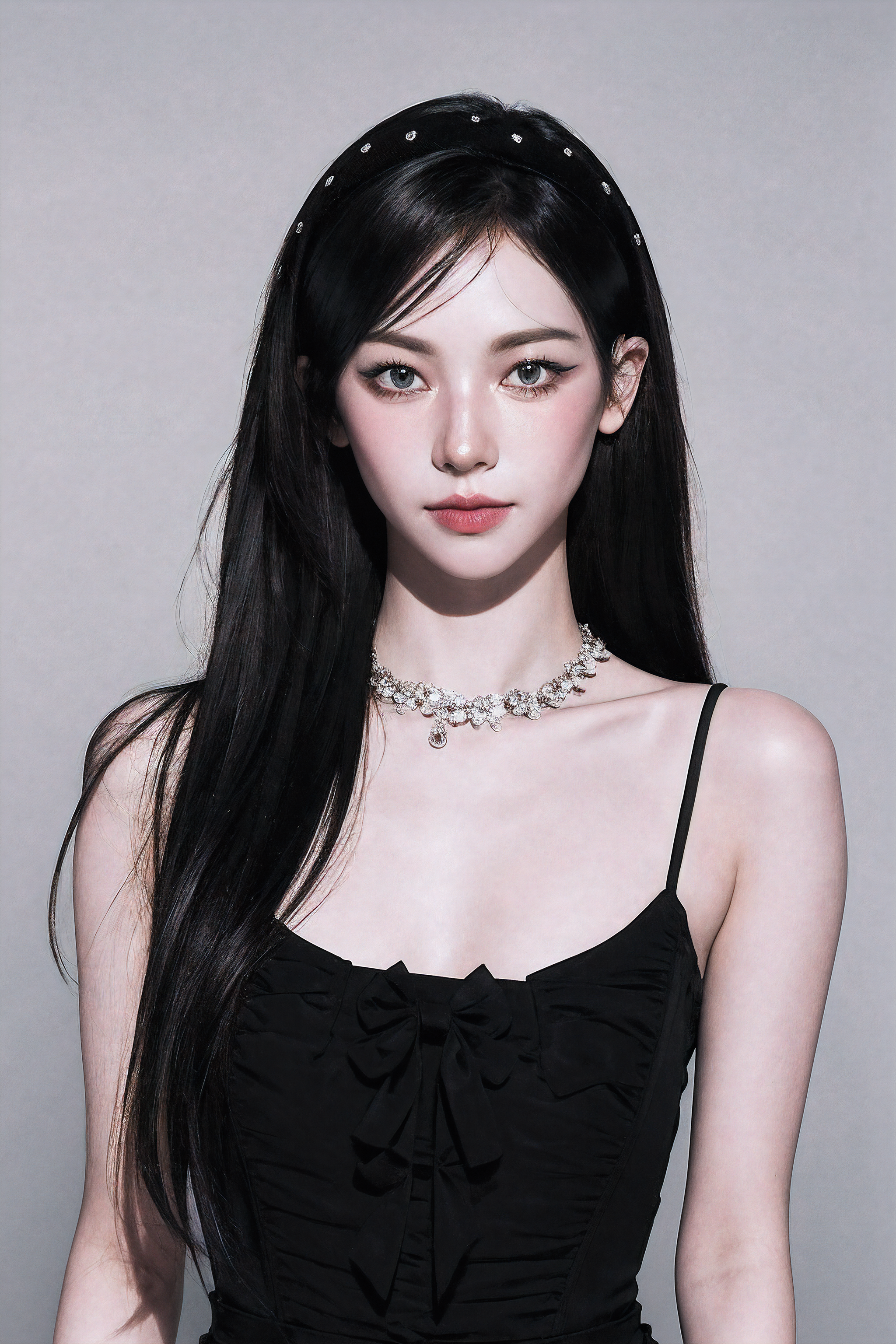 Karina, MBC, 8k portrait, intricate, elegant, highly detailed, majestic, digital photography, art, broken glass, (best quality, high quality, highres, masterpiece, side lighting), (looking at viewer:1.5), 1girl, solo, black hair, brown eyes, polka dot dress, polka dot hairband, soft and supple, smooth and flawless, pure and radiant, finest, natural skin with a delicate translucence, simple background,