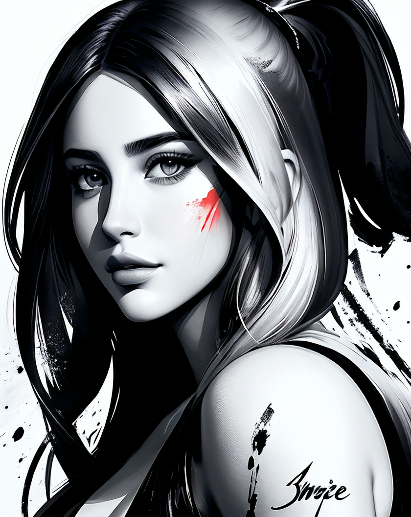 Ink and Shadows: An abstract character portrait of a brooding and enigmatic female (JGmrsbe11a:.99)figure, created with ink splatters and dynamic brushstrokes. The shadows play with his features, leaving an air of mystery and allure. The artist's use of abstract ink techniques adds depth and complexity to the character's persona.