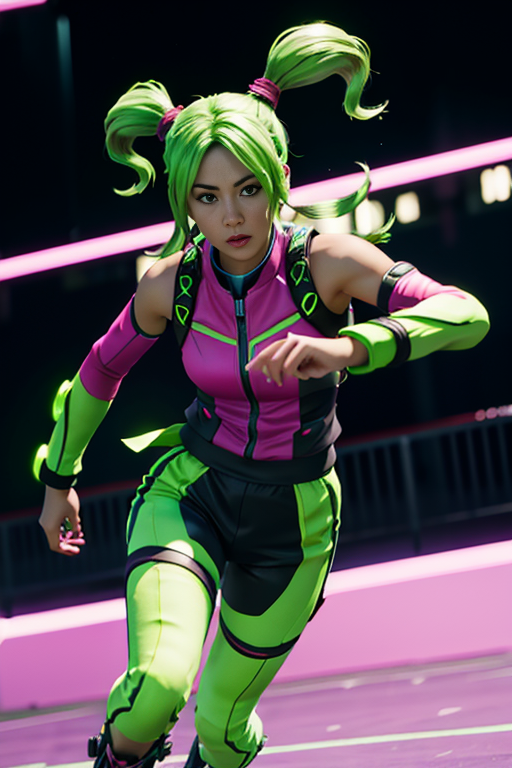 neon green twintails, zoey <lora:Zoey:0.45>, extremely luminous bright design, extremely pastel colors, (future combat background:1.4), pastel colors, focused, full neon lights combat suit, full body, high quality, highres, 1girl, running, hurry,