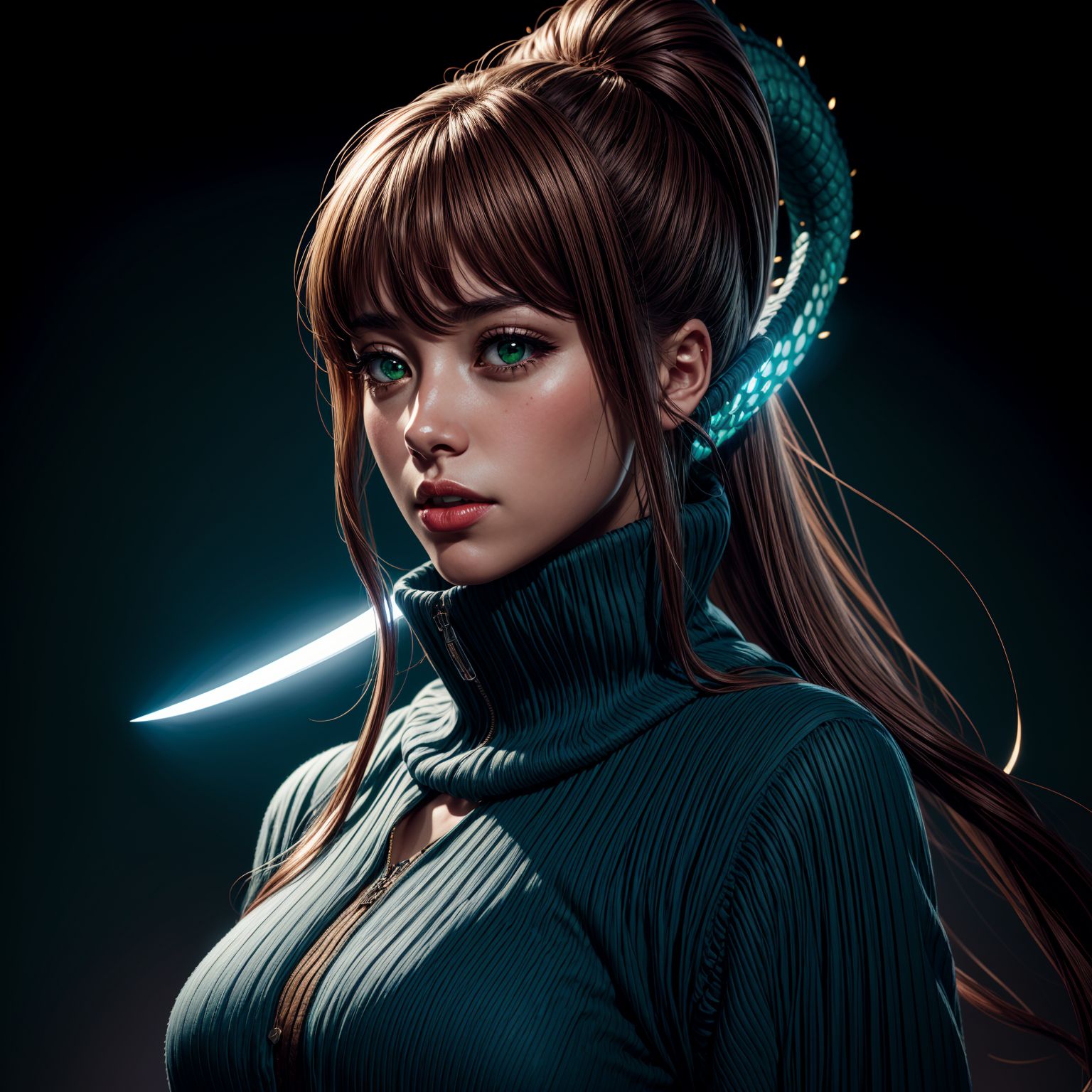 (Monika, green eyes, ponytail, gorgeous face, very long hair, perfect body), (mysterious:1.3), ultra-realistic mix fantasy,(1 giant eastern dragon:1.3) behind a woman holding a glowing sword,void energy diamond sword, in the style of dark azure and light azure, mixes realistic and fantastical elements, vibrant manga, uhd image, glassy translucence, vibrant illustrations, ultra realistic, head jewelly, jewelly, shawls,light In eyes, red eyes, portrait, firefly, bokeh, mysterious, fantasy, cloud, abstract, colorful background, night sky, flame, very detailed, high resolution, sharp, sharp image, 4k, 8k, masterpiece, best quality, magic effect, (high contrast:1.4), dream art, diamond, skin detail, face detail, eyes detail, mysterious colorful background, dark blue themes, <lora:DetailEnhancer:0.8>, <lora:DDLC:0.7>
