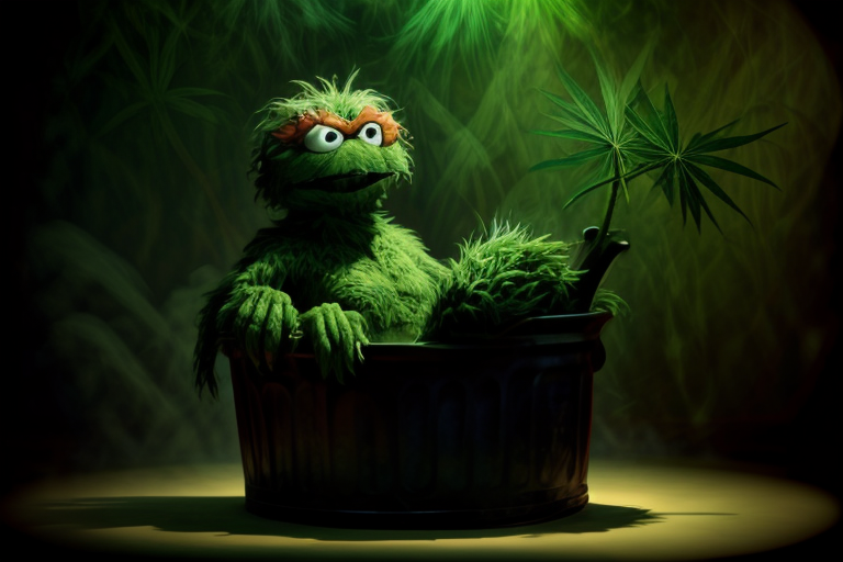Style: Surreal Digital Illustration Description: Craft a surreal digital illustration of Oscar the Grouch engulfed in massive cannabis plants. Oscar should be reclining on a throne made of marijuana leaves, his trash can overflowing with premium buds. The scene should be illuminated by the soft glow of psychedelic lights, with the plants twisting and morphing into strange and fantastical shapes. <lora:add_detail:1>,<lora:oscar-v1:1>,<lora:lcm-lora-sdv1-5:1>