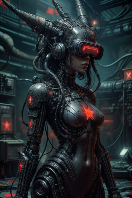 cyberpunk cityscape,biomechanical cyberpunk,SCI-FI, cowboy shot,thigh gap, femenine cyborg,helmet with antenna,mask,armor,robot joints, (wires,cables,electricity,discharge,monitors:1.2), high technical room background, <lora:Concept_-_Hella-sthetic_v2:0.7>, (USSR,red star \(symbol\):1.5), <lora:H.R.GigerWorld:0.25>,gigerworld,art by hrgiger, <lora:Concept_-_Giger-ish_Biomechanicals_v2:0.25>,hnsrdlf style, <lora:Concept_-_More_Details_v1.0:1>, intricate,elegant,highly detailed,symmetry,magical atmosphere,sharp focus,majestic,very coherent,radiant,advanced,cinematic,artistic,fine detail,winning,beautiful,stunning,dramatic light,designed,rich deep colors,perfect professional background,ambient,tailored set composition, human-machine fusion,organic meets artificial,futuristic,technological,cybernetic enhancements,robotics,neon lights,dark, <lora:Concept_-_PicXer_bSide:1>,<lora:vrLORA:0.7>, VR,VR Headset,Head-mounted display,vrlora,