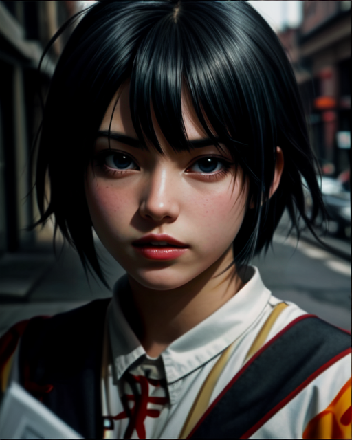 1girl, solo, masterpiece, (anime screencap:1.2) , indoors, medium shot, street art by Kurt Wenner, installation art, medium close-up shot of a"Beyond the Inferno", Aggressive, F/1.8, Saturated