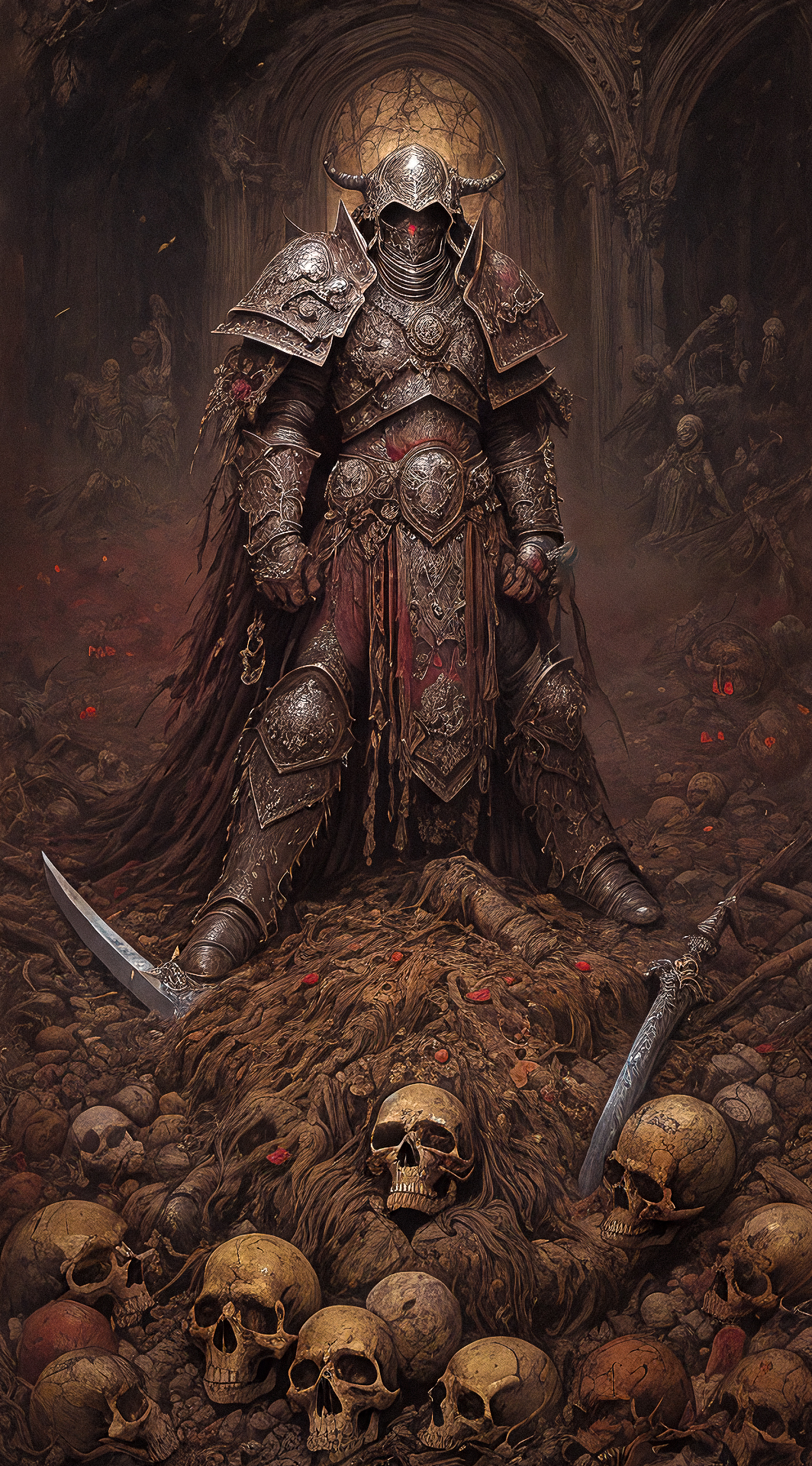 a male chaos warrior of khorne in armor is holding a great sword in a ruined post-apocalyptic city, sci-fi, fantasy, horror, skulls on the ground, blood, Storm, , (James Ensor,Unica Zurn,Zdzislaw Beksinki:1.25), Skeletons,Weeping statues, Paranormal,Apparition, (Metallics:1.1), (Shape:1.1), (Monotyping:1.1), (Strobe light:1.2), Stone, Rhombus, ultra detailed, intricate, oil on canvas, dry brush, (surrealism:1.1), (disturbing:1.1) <lora:khorne:0.7> <lora:methurlant:0.5>