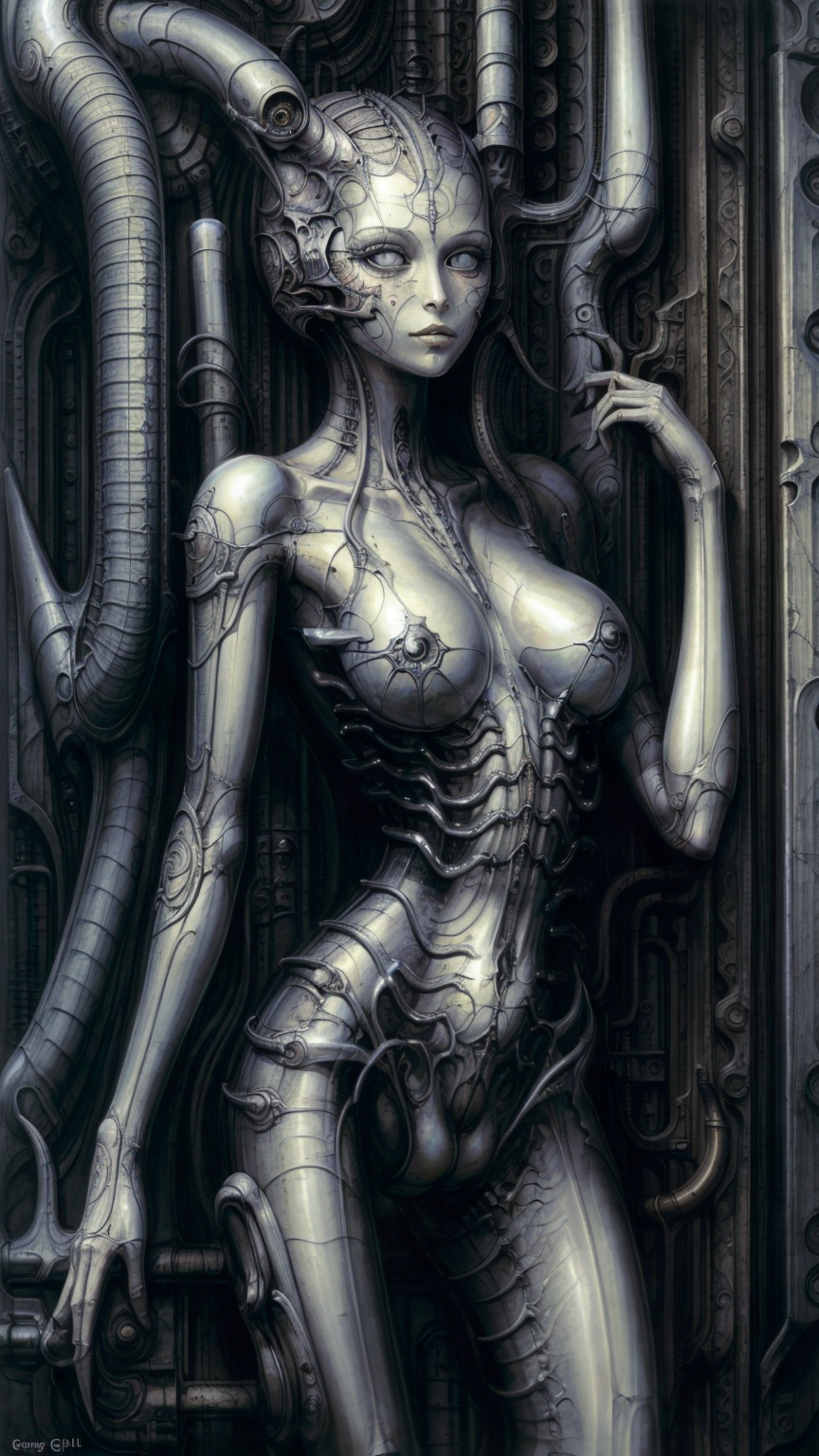 (masterpiece, best quality, detailed), realistic,<lora:more_details:0.5>, Surrealism, by Hans Rudolf Giger, 1girl, holding, <lora:hrgiger2x:1>