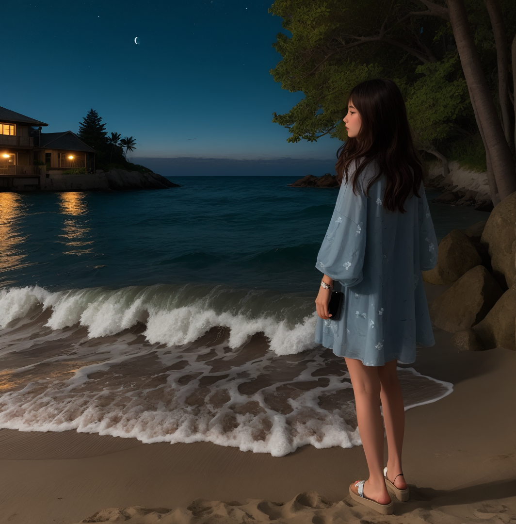 1 girl, summer4, blue , night, bokeh, light, full body, front view, portrait, beach, ocean, wave