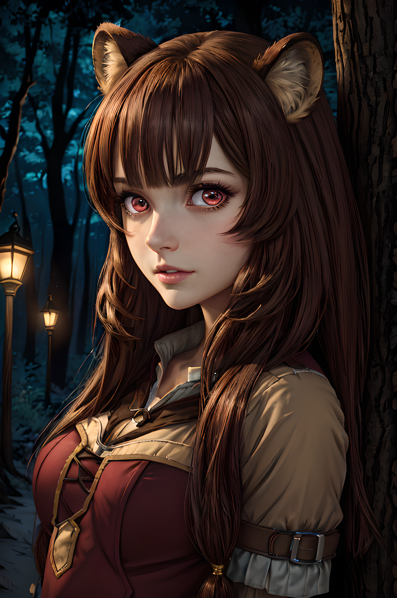 8k , masterpice, 1girl, detailed, style anime, <lora:Raphtalia:1> , Raphtalia , red eyes, brown hair , adult, breast, detailed face, detailed eyes , raccoon girl, in a dark fantasy forrest, <lora:epi_noiseoffset2:1.3>, at night, night, dimmly lit, pine forrest, raccoon ears,