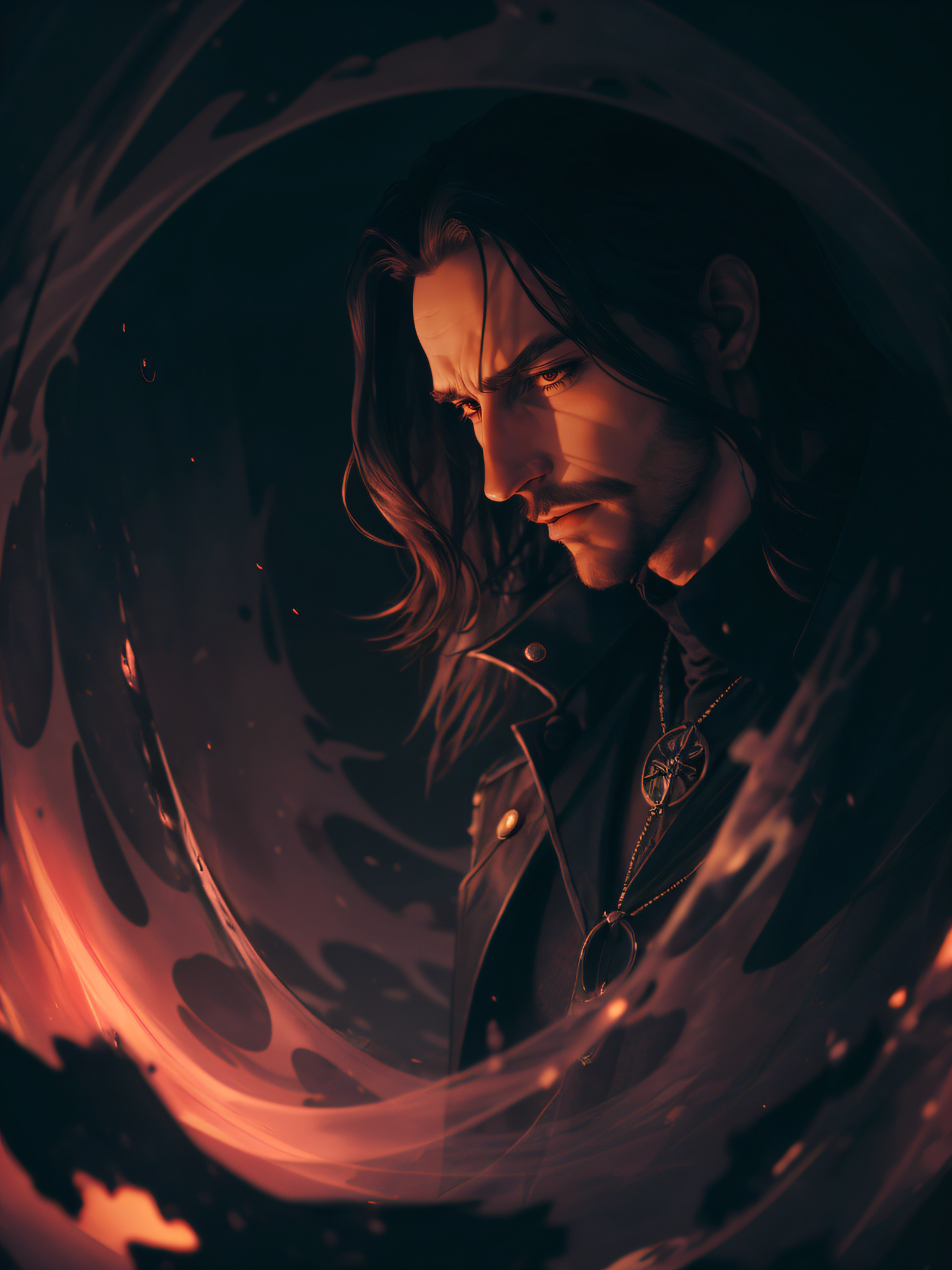 Abstraction takes center stage in this evocative representation of Alucard. Swirling, dark colors (palette:1.3) create a vortex of emotion around the character, hinting at the internal turmoil he carries. Shapes blend and meld, blurring the lines between reality and fantasy (perception:1.2), much like Alucard's enigmatic persona. The use of fluid brushstrokes (technique:1) adds a sense of movement, drawing the viewer deeper into the artwork. In the background, ethereal structures (elements:1) hint at the supernatural realm Alucard inhabits, creating an atmosphere of eerie beauty.