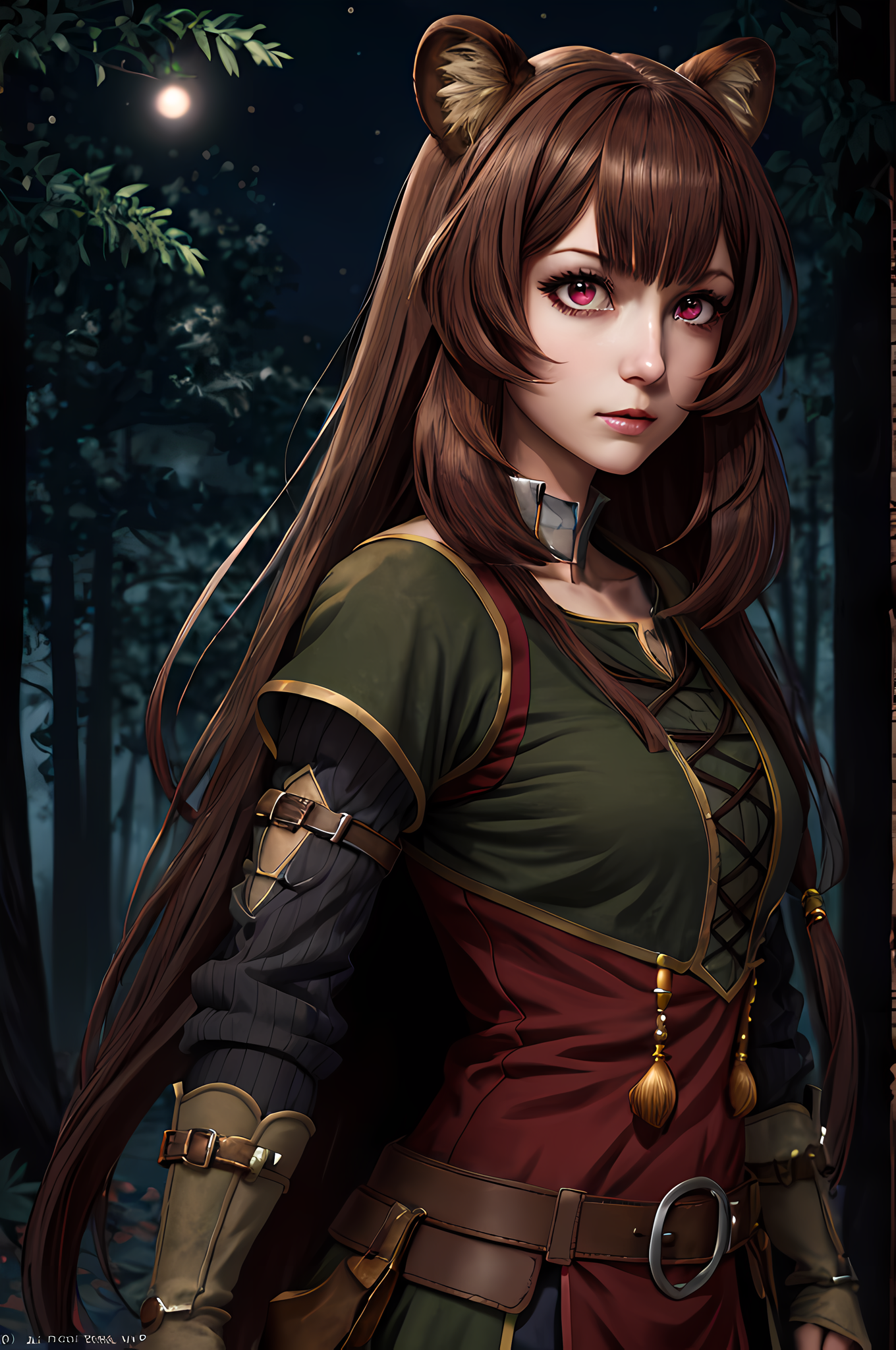 8k , masterpice, 1girl, detailed, style anime, <lora:Raphtalia:1> , Raphtalia , red eyes, brown hair , adult, breast, detailed face, detailed eyes , raccoon girl, in a dark fantasy forrest, <lora:epi_noiseoffset2:1.3>, at night, night, , pine forrest, raccoon ears, fighting stance, holding sword, <lora:Gloomifier_slider_LECO_500w:1.2>