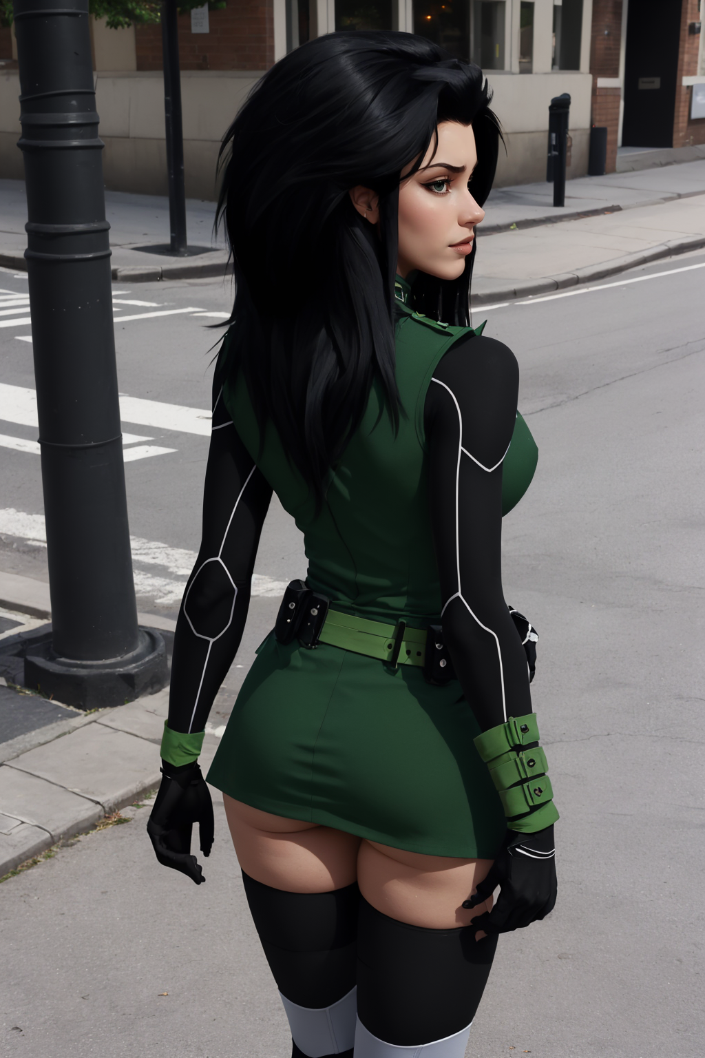 (masterpiece, best quality:1.2), <lora:cheshire:.9>, cheshire, 1girl, solo, black hair, green eyes, belt, hair tubes, long hair, breasts, large breasts, gloves, cosplay, black gloves, bodysuit, thighhighs, from above, from behind, outdoors, street,
