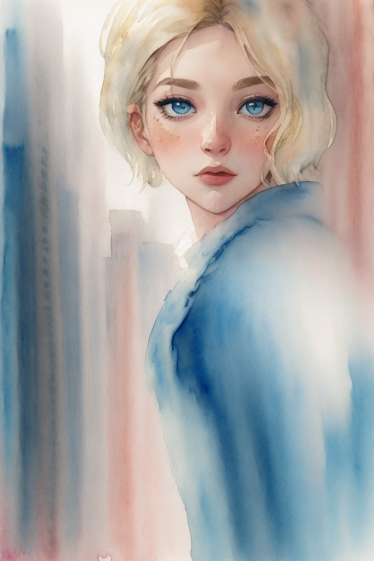 <lora:gwen:0.5>, graphic poster, ((skyscrapers)), (city), ((watercolour, running watercolour:1.6)), (gwen_stacy), (1girl), portrait, solo, spider-suit, blonde_hair, short_hair, (side of head shaved), sidecut, asymmetrical_hair, eyebrow stud, thoughtful, detailed eyes, (dynamic), multicoloured, abstract, soft lines, indistinct, vertical blur, cinematic lighting, (painting by Robbi Rodriguez), light colours, saturated colours, masterpiece, white, teal, magenta, black