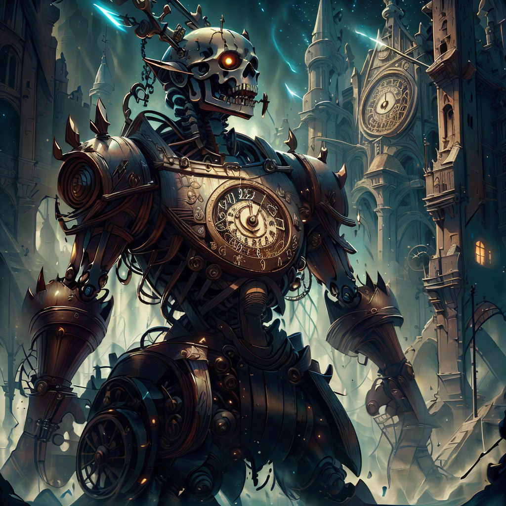 WoodIronAI, a grinning skeleton who has come to life, egyptian motifs, spooky scary skeleton come to life, D&D, fantasy, intricate, <lora:ChronomancyAI-000010:.9> ChronomancyAI, cinematic lighting, highly detailed, digital painting, artstation, concept art, smooth, sharp focus, illustration, art by Artgerm and Greg Rutkowski and Alphonse Mucha, dynamic background, <lora:WoodIronAI:.9>