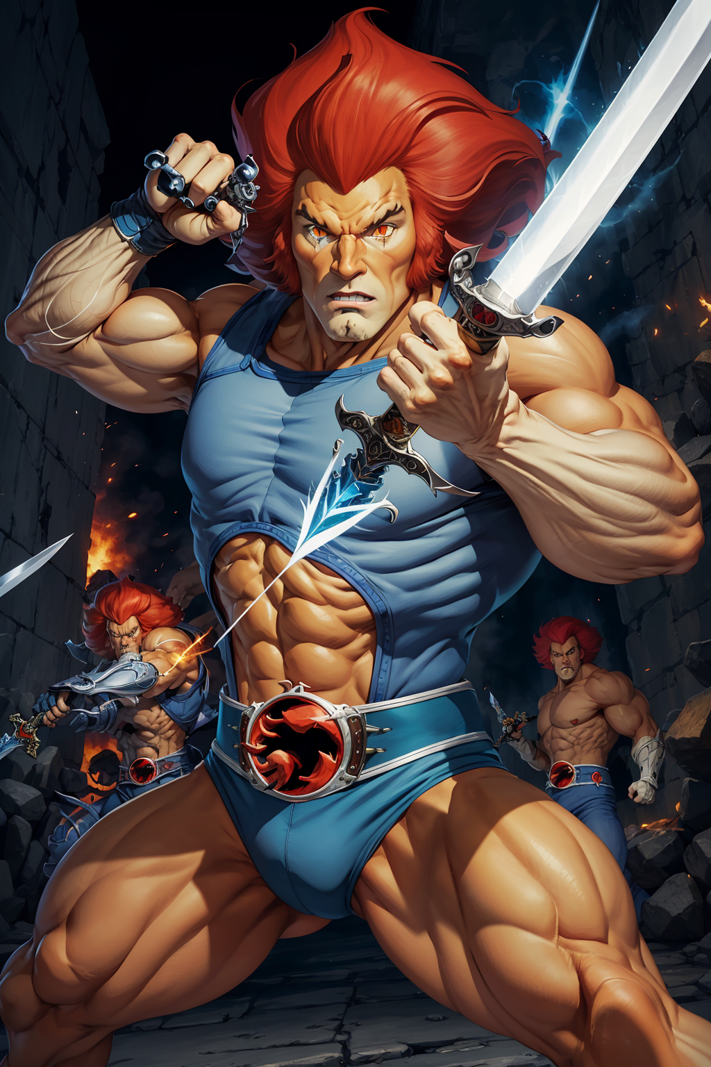 cartoon,best quality, masterpiece, detailed, lion-oQuiron character, 1boy, red hair, rampage, blue outfit, using sword, fight, action pose, <lora:quiron_lion-o_v2_Lora:0.77>