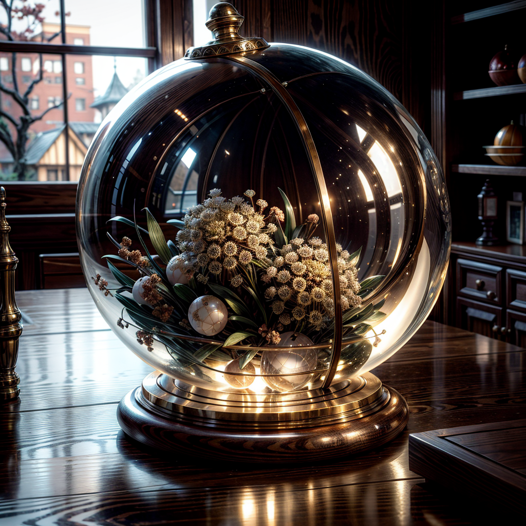 ((intricate details, hyperdetailed)),RAW,F/x 1,photorealistic,Hyper-realism,ambient occlusion,light defraction,depth of field,3D,hdr,8k,raytracing,realistic shadow,volumetric light,bloom,(Large Tall sealed glass spherical biosphere with realistic hot asian in micro bikini),sitting on a beautiful old polished wooden desk,rustic office background,wood,brass,realistic glass,scattered adventurers gear,amber dim lighting,best quality,beautiful composition,concept art,masterpiece,intricate,octane render,award winning photograph,trending on artstation,unreal engine 5,original, <lora:more_details:0.8>