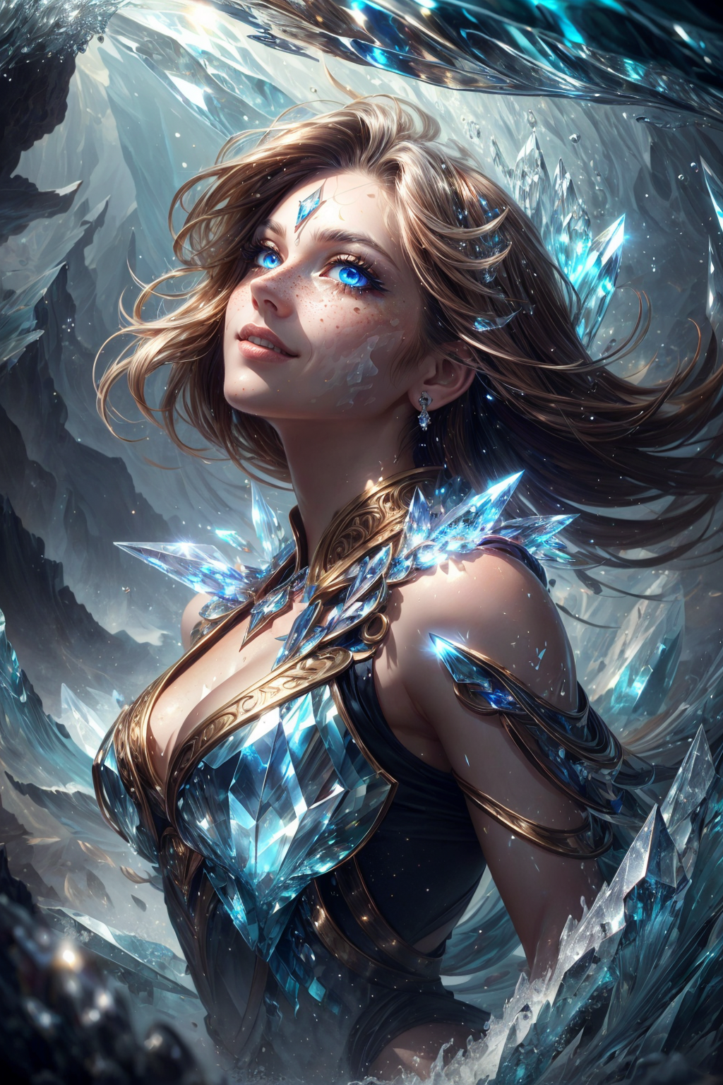 (masterpiece, best quality), intricate details, <lora:add_detail:1> 1 girl, adult irish woman, freckles, light blue eyes, brown medium hair, (style-swirlmagic:0.8), portrait, solo, half shot, looking up, detailed background, detailed face, (<lyco:FiveDecorsAIx3:0.5>, crystallineAI, crystalline theme:1.1), mercury-wizard, smiling, surrounded by waves of glowing silver, shining (clothes:0.8), mercury patterns, alchemical symbolism,controlling mercury , reflective pools, silver-colored fluid, metallic sheen, floating particles, radiance of mercury shining metal in background, flowing mercury formations, dramatic lighting, cinematic atmosphere, <lora:LOL:0.5>,