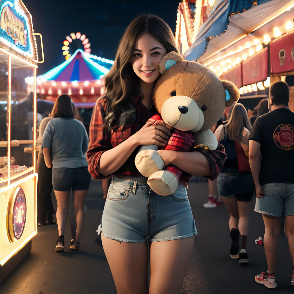 <lora:highwaistedshorts:1.0>, woman wearing high-waist shorts and flannel shirt, holding giant teddy bear, carnival fair, night time, masterpiece, 8k, high resolution, shallow depth of field, sharp focus