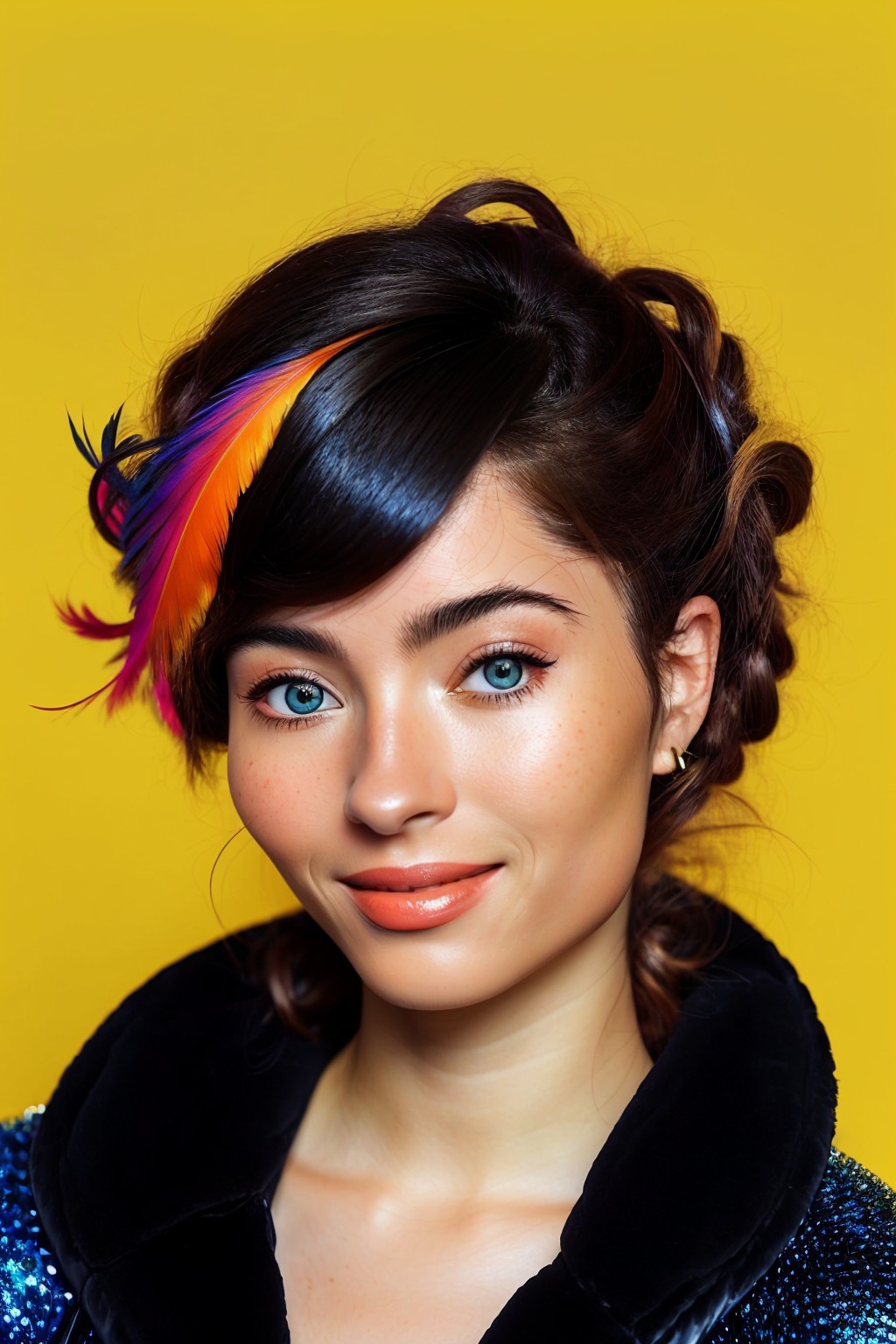 crypto art style, digital, vibrant, blockchain, detailed, close range photo of <lora:sd15_ReneeMurden_v1:.9> ReneeMurden, focus on smiling face, wearing a feather jacket , her hair is styled as curly bangs hair,