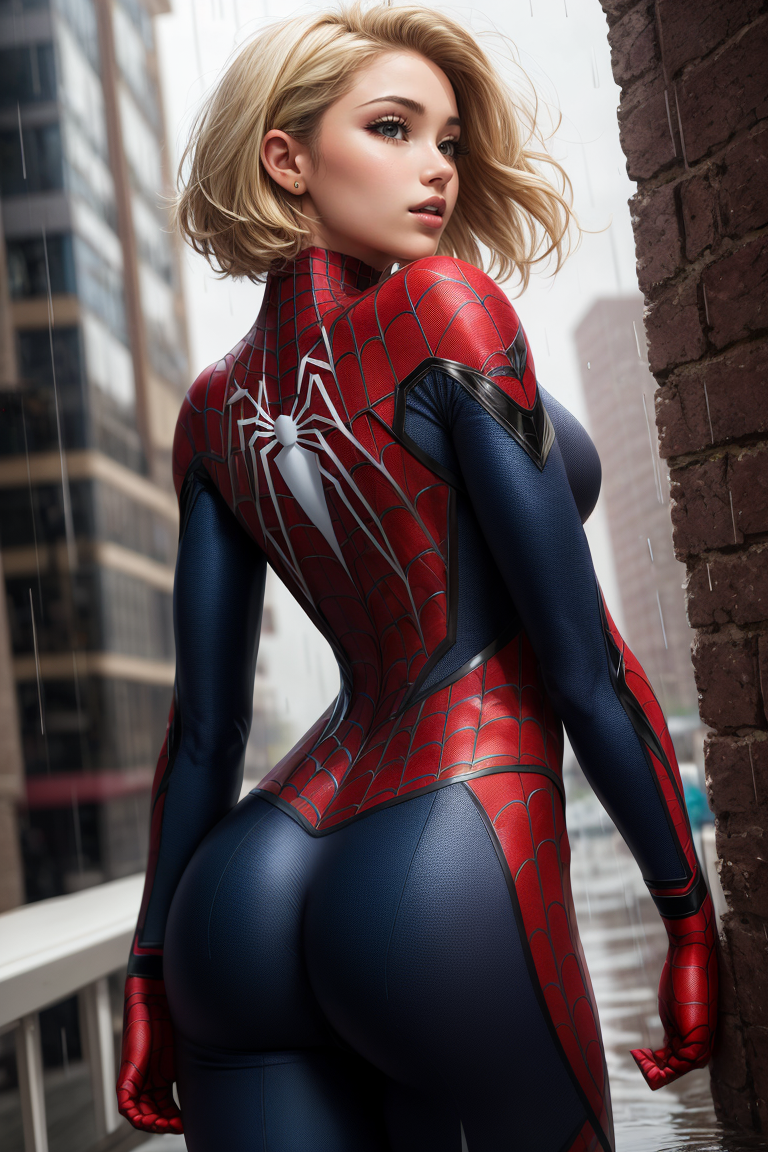 18 yo girl, white spider man suit, short blunt hair, blonde, beautiful face, rain, masterpiece, intricate detail, perfect anatomy, ass focus, arch back, <lora:GrabOwnAss-DIM1:1>, <lora:add_detail:0.5>