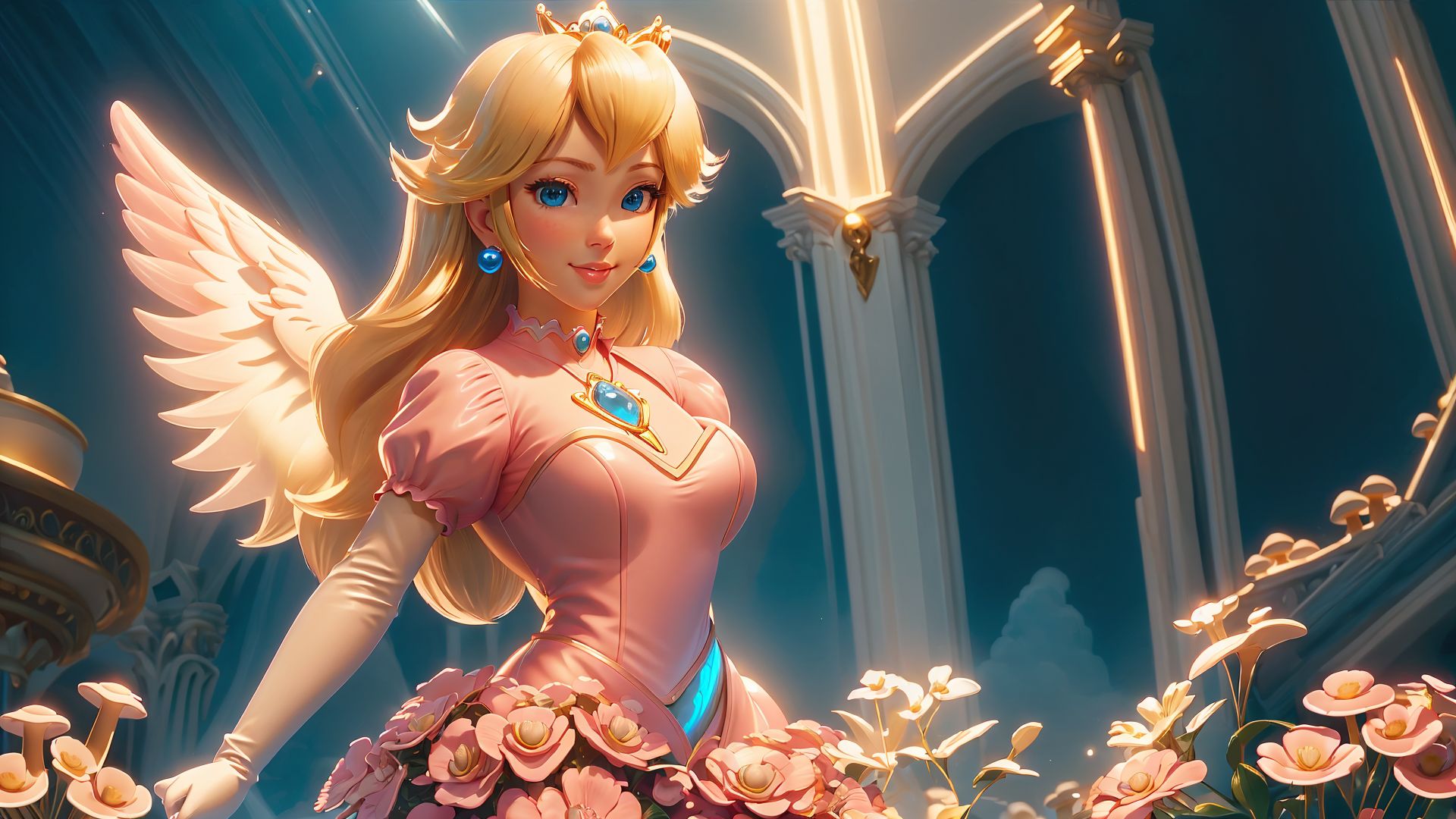 (<lora:AngelicAI:0.6> AngelicAI),highres,masterpiece,perfect ligthing,bloom,cinematic lighting,adult,perfect skin,female,cowboy shot,smile,narrow waist,skinny,<lora:PrincessPeachMovie:0.6>,(PrincessPeach),(a pink transparent Princess Peach),choker,detailled eyes,blue eyes,choker,sensual,mushrooms,mushroom kingdom,pink lips,((glossy lips)),pursed lips,pink pumps,glossy skin,oily skin,beautiful light,(day:1.3),bright,looking at viewer,<lora:3DMM_V11:0.4>,