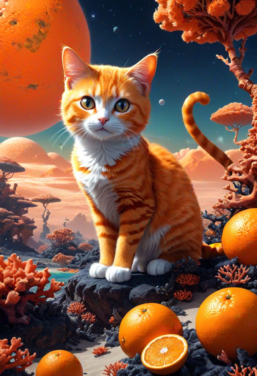 score_9,score_8_up,score_7_up,rating_questionable, beautiful catorange, oranges in the form of cat, surreal, beautiful scenery, alien planet of coral riffs