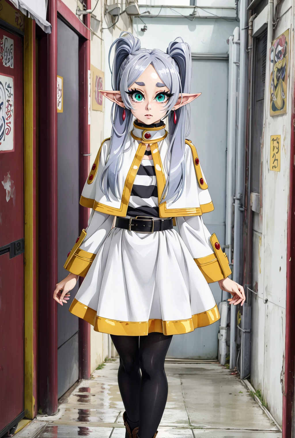 <lora:СÑÐ¸Ð»Ñ [GP]Bongf style:0.9>,<lora:ФÑиÑен пÑовожаÑÑÐ°Ñ Ð² поÑледний пÑÑÑ(aafrie,long hair, white hair,twintails, pointy ears,earrings, thick eyebrows,(Ñм одеждÑ):0.7>,aafrie, long hair, (white hair), 2twintails, pointy ears, earrings, thick eyebrows, white capelet, striped shirt, long sleeves, belt, white skirt, black pantyhose,green eyes, small breasts, flat, anime style, anime colors,detailed anime,animeHD, anime eyes, bigger eyes, high quality anime, large anime pupils, 1girl (in full growth), best quality, masterpiece, ultra-detailed, high quality,perfect anatomy, (perfect full body), (detailed full body), good eyes, perfect face, pretty face,(beautiful and aesthetic:1.2),beautiful eyes, anime eyes, detailed eyes,Exquisite visuals, high-definition