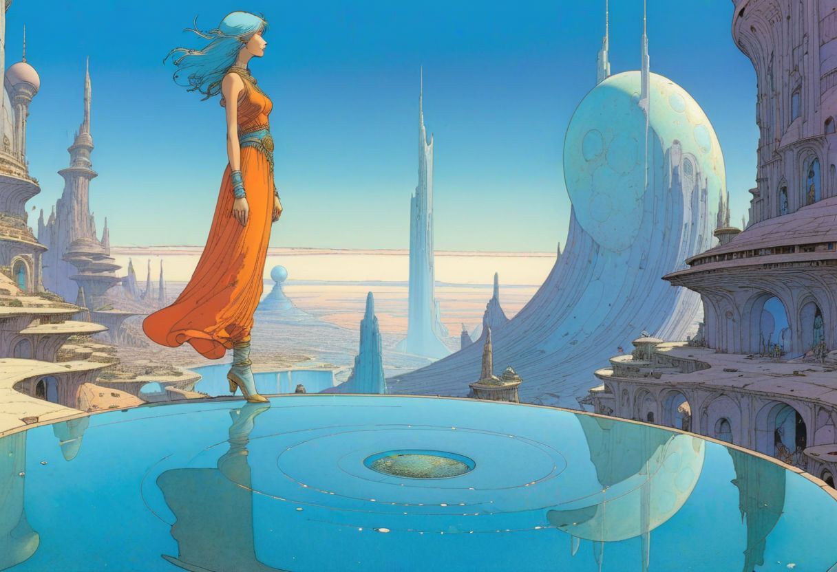 In the unpublished and breathtaking image from the Arzach album by Moebius, the essence of the Master's artistry shines through with remarkable clarity. in the foreground a mystical and beautiful woman standing on a circular stone who flies through the air in a busy street of a extraordinary city designed by Moebius, witg a lot of water. The vertical composition, elegantly presented in a 2:3 format, unveils a scene of unparalleled beauty that resonates perfectly with the spirit of the album. Prepare to be mesmerized by the sheer originality that permeates every aspect of this artwork. As your eyes wander across the canvas, you'll encounter a harmonious fusion of elements that defy convention and ignite the imagination. It is a visual symphony that stands as a testament to Moebius's boundless creativity. Vibrant and sublime colors dominate the image, bursting forth with a luminosity that captivates the viewer.