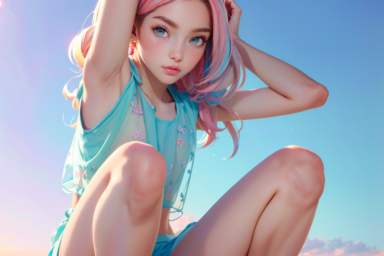 (1girl:1.2, (masterpiece:1.4, best quality), small breasts, skinny, sexy, ultra detailed, (pastel colors:1.2), squatting, arms behind head cowboy shot ,beautiful and aesthetic), see-through (clothes), detailed, detailed skin texture, day, light particles, (masterpiece, top quality, best quality, official art, beautiful and aesthetic:1.2), colorful <lora:epi_noiseoffset2:1.3> <lora:MyBreastHelper:1> <lora:3DMM_V12:1>