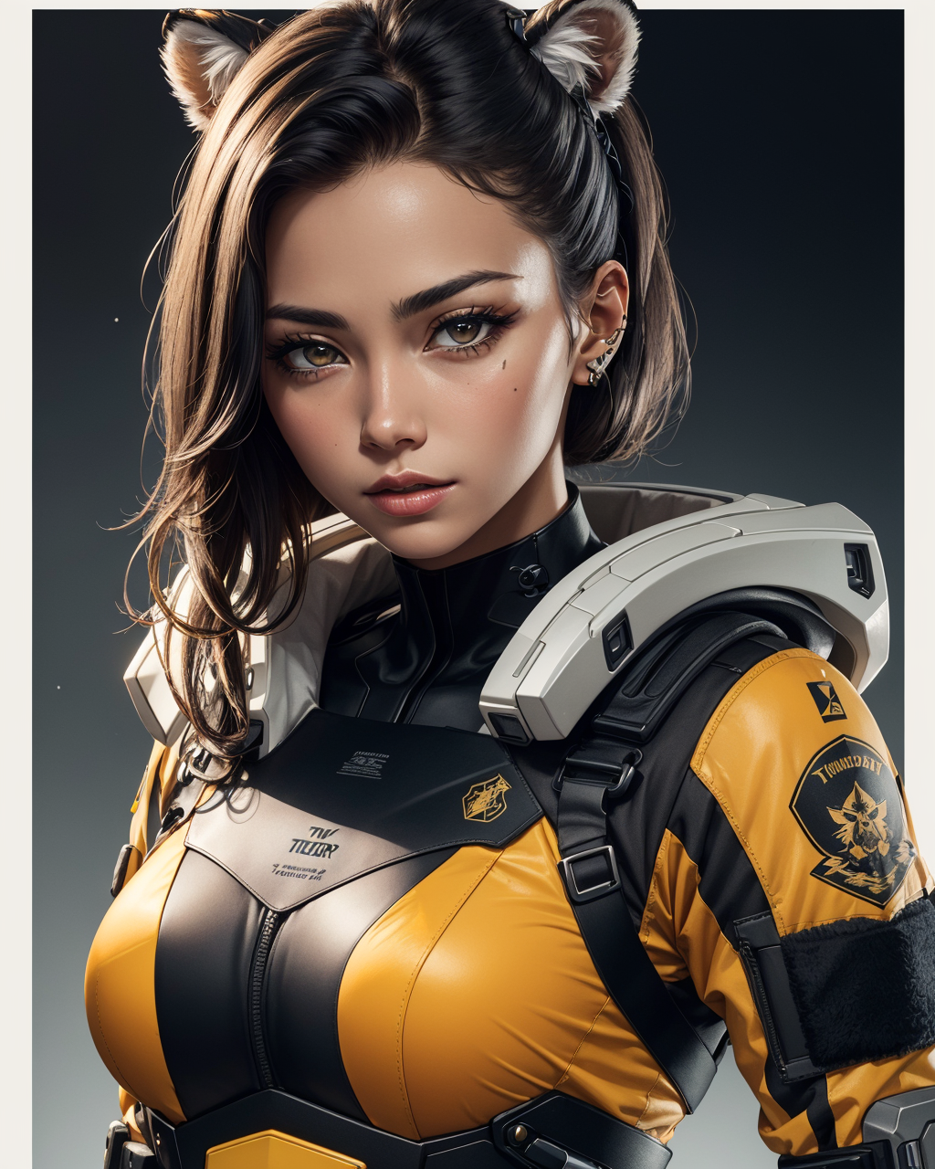 (masterpiece:1.1), (highest quality:1.1), (HDR:1.0), extreme quality, cg, 1girl, detailed face+eyes, honey, (honeycomb), (tactical army uniform), (bright colors), splashes of color background, colors mashing, paint splatter, complimentary colors, neon, (thunder white tiger), electric, limited palette, synthwave, fine art, tan skin, upper body, violet, time stop, epic journey, apparatus , top tier