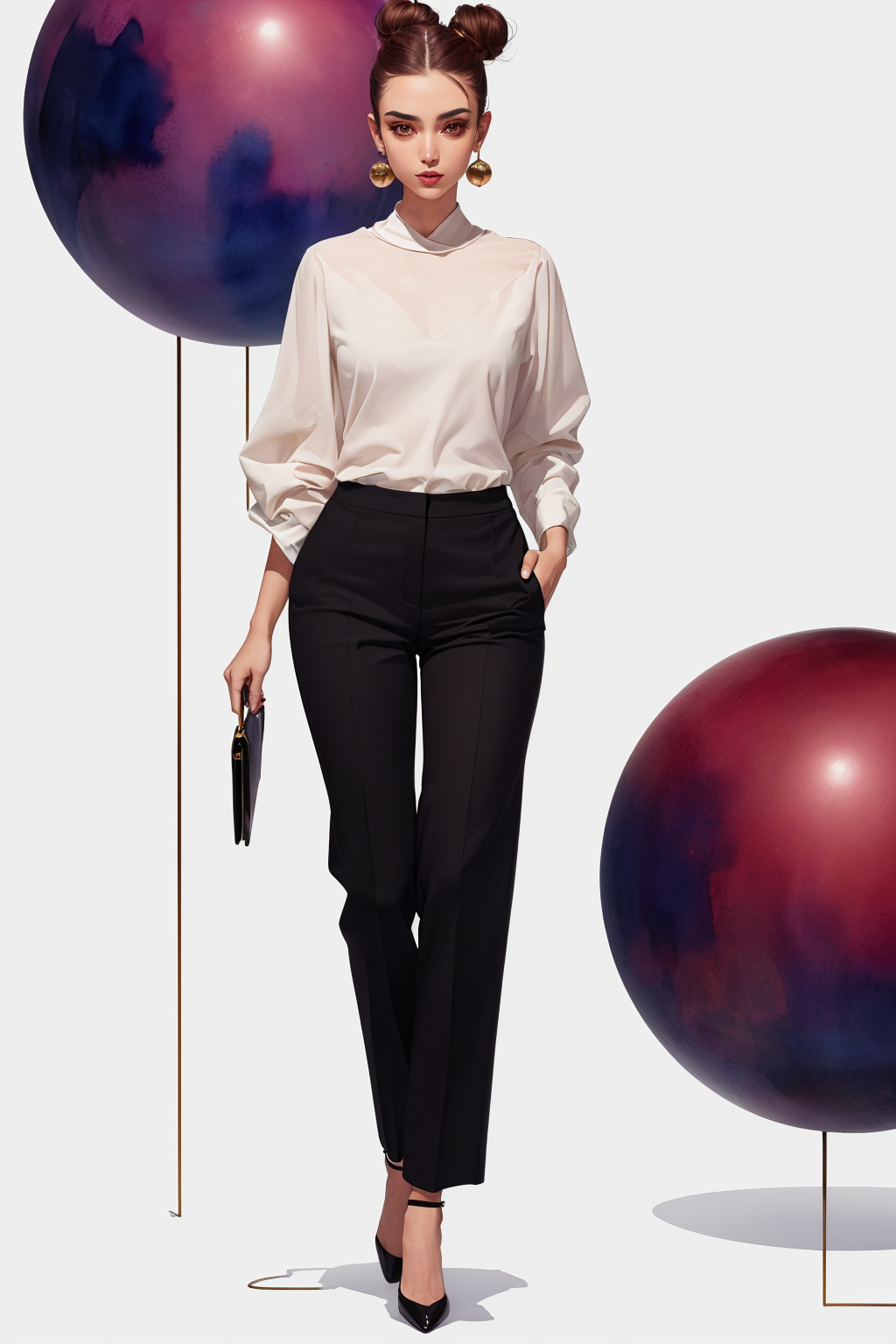tariq, illustration, ink color, watercolor, 1girl, solo, long legs, catwalk, full body shot, magnificent, slacks, auburn, sphere earrings, bun cover, white background, <lora:add_detail:1>, <lora:anumtariq-04:1>, <lora:fashigirl-v5.5:0.8>