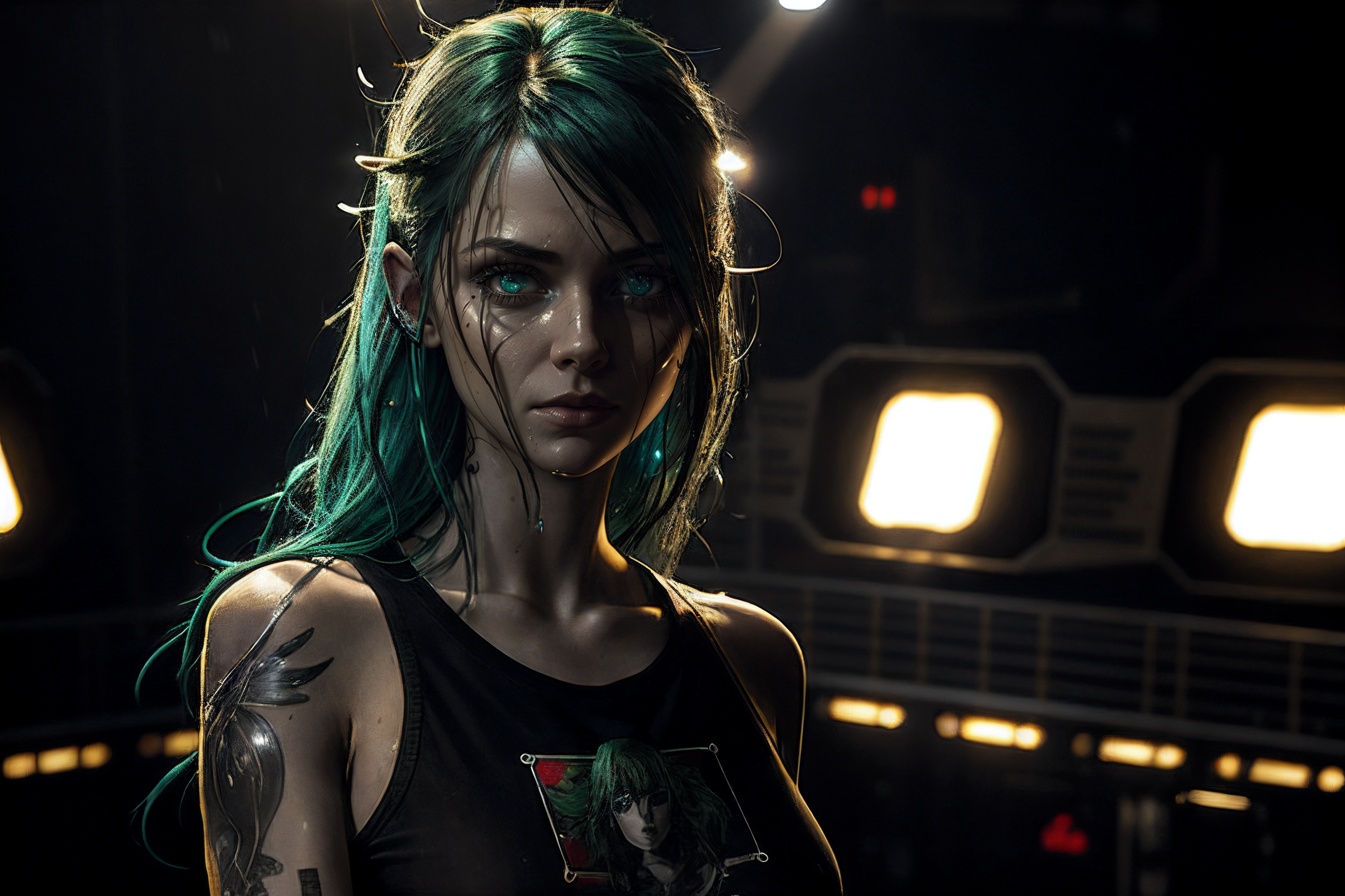 best quality, masterpiece, (photorealistic:1), 1girl, graphic tshirt, sleeveless, (cinematic lighting:1.9), facing viewer, piercings, tattoos, punk girl, mech warehouse background, long flowing green hair, <lora:photorealistic02:0.9>, wet skin, rain, disheveled, messy hair, <lora:add_detail:0.25>, depth of field